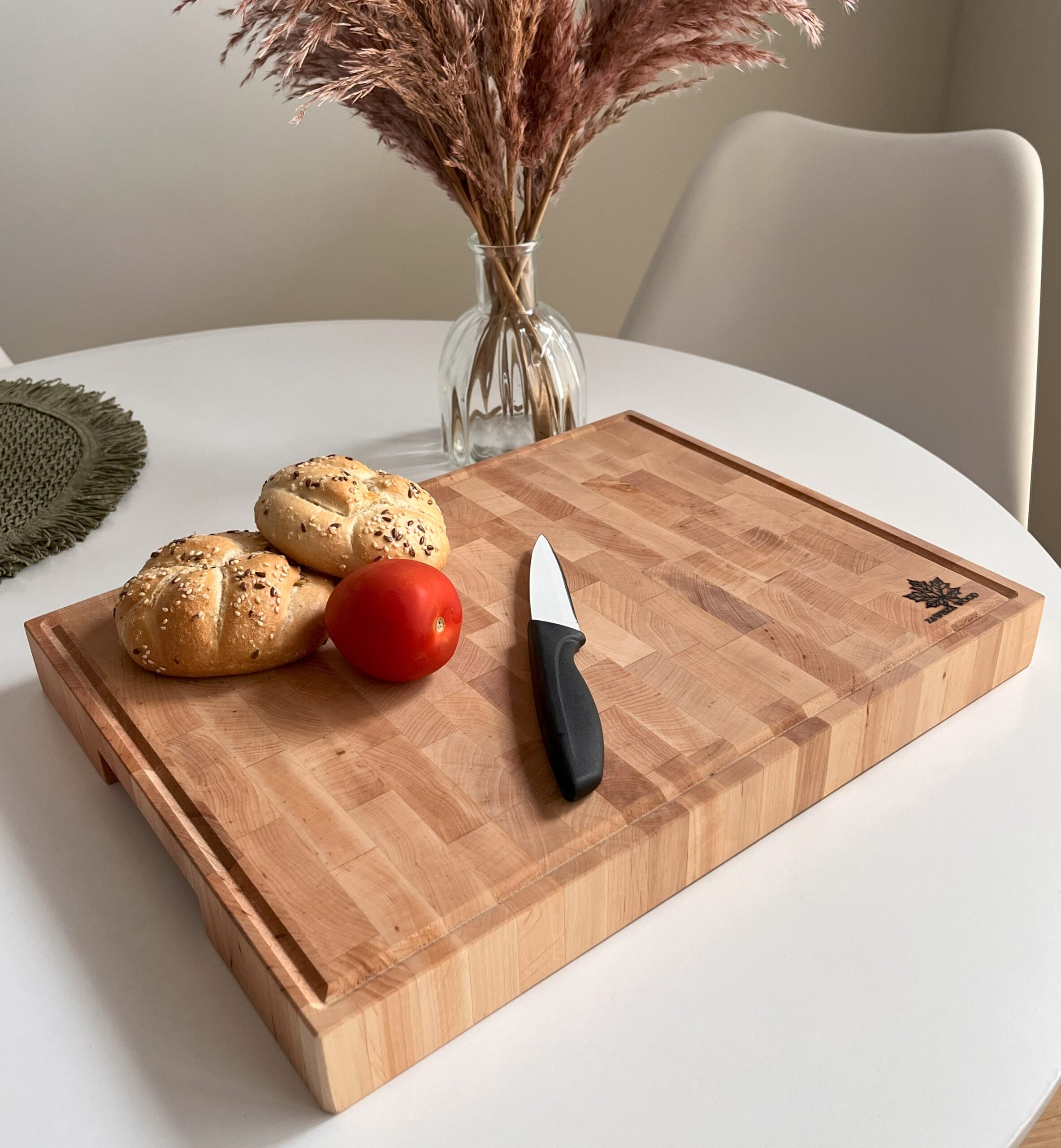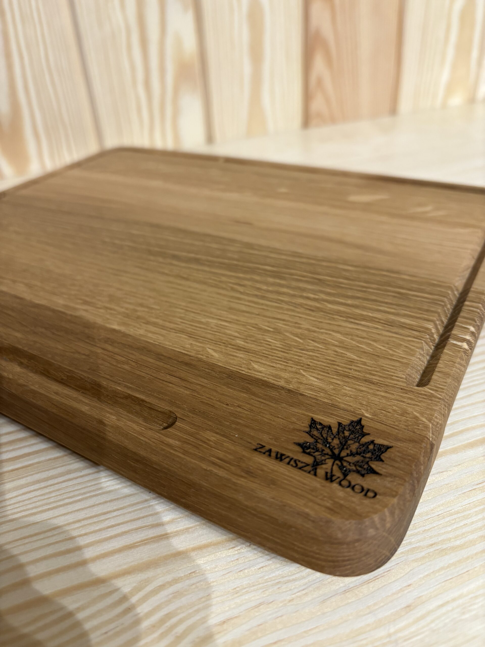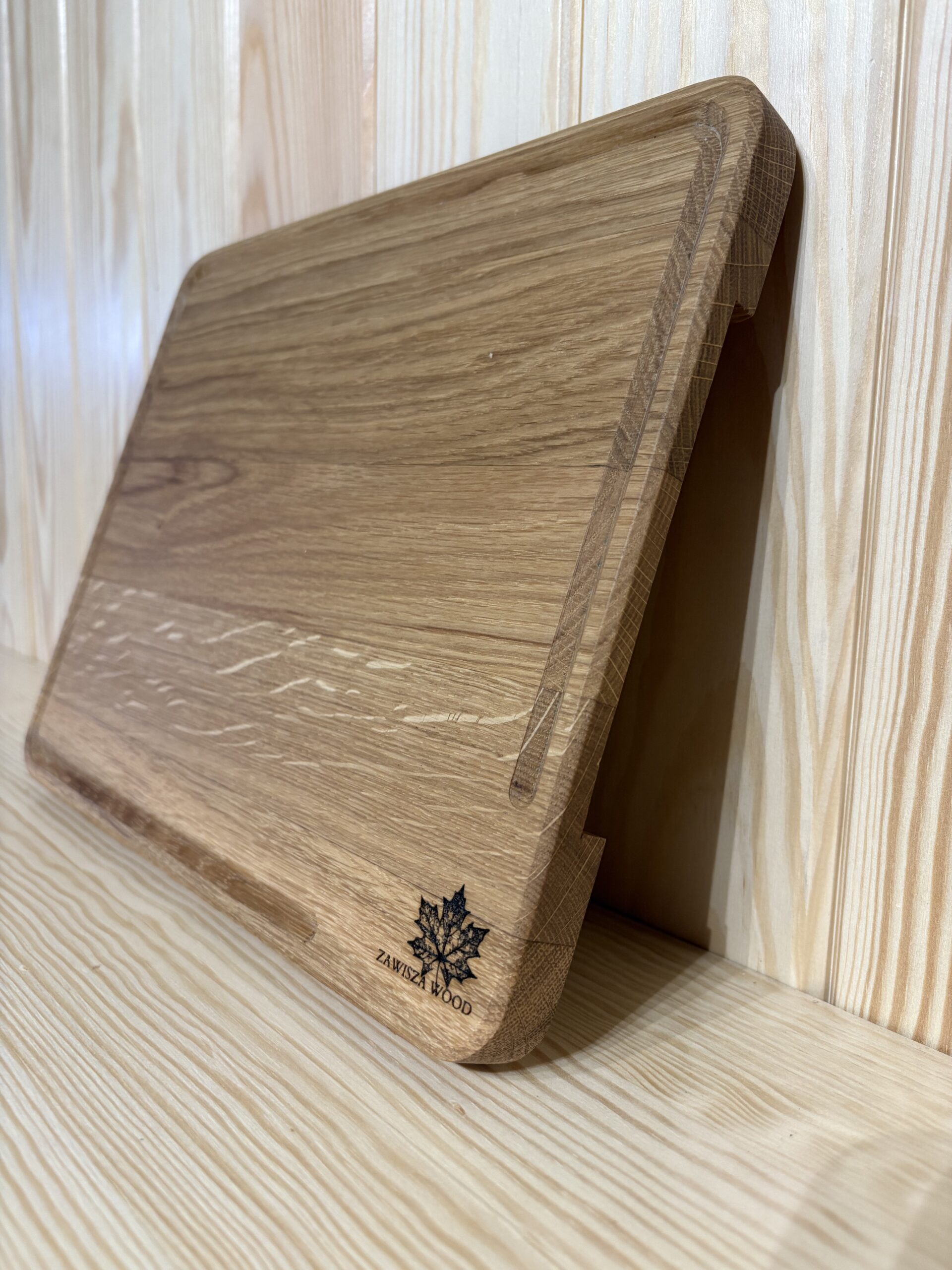 Układ sztorcowy sprawia, że powierzchnia jest bardziej odporna na nacięcia i przyjazna dla ostrzy noży. Górna krawędź deski została wykończona frezowanym rantem z rowkiem do odprowadzania soków, który skutecznie zbiera płyny podczas krojenia.